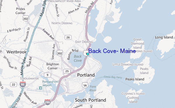 Use this relief map to navigate to tide stations, surf breaks and cities that are in the area of Back Cove, Maine.