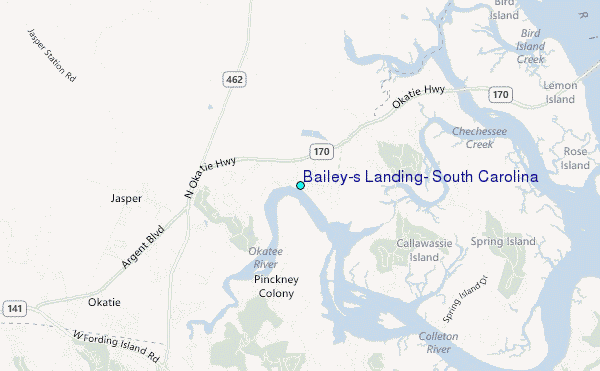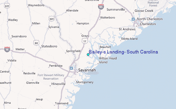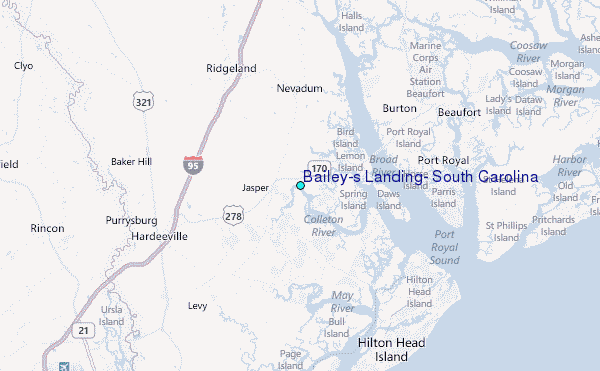 Use this relief map to navigate to tide stations, surf breaks and cities that are in the area of Bailey's Landing, South Carolina.
