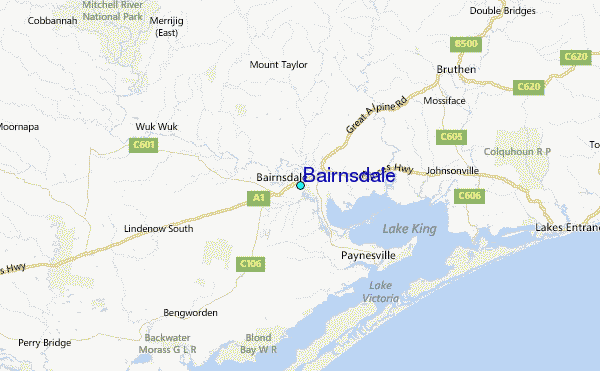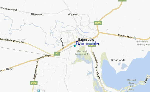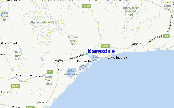Use this relief map to navigate to tide stations, surf breaks and cities that are in the area of Bairnsdale.