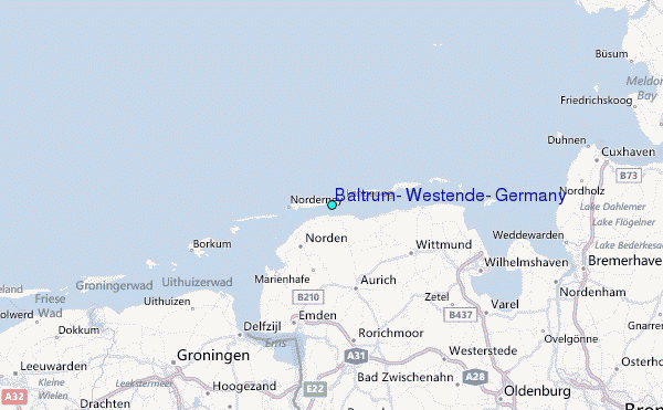 Use this relief map to navigate to tide stations, surf breaks and cities that are in the area of Baltrum, Westende, Germany.