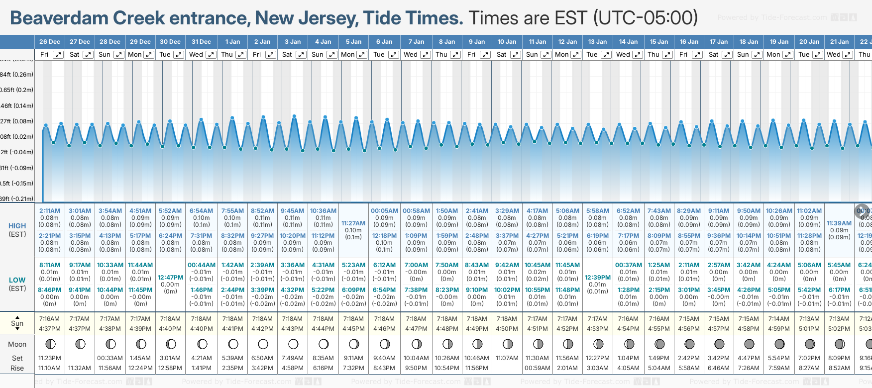 December and January Tide charts for Beaverdam Creek entrance: The tide charts below show the height, time and date of high and low tides for the next 30 days.