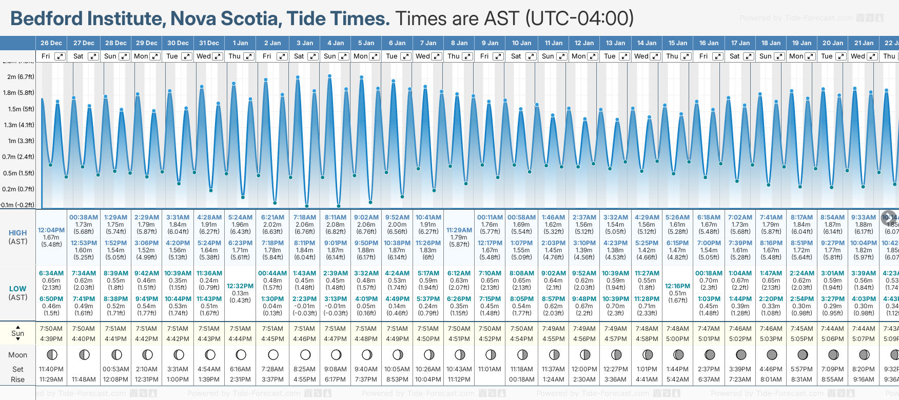 December and January Tide charts for Bedford Institute: The tide charts below show the height, time and date of high and low tides for the next 30 days.