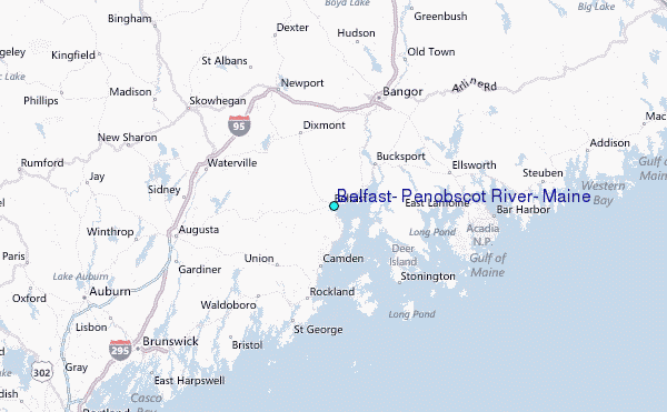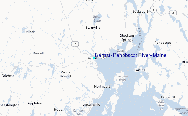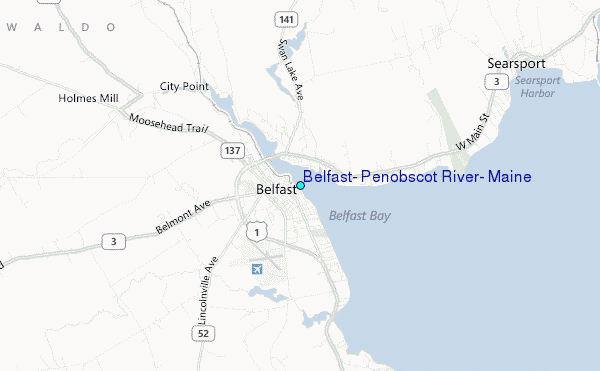 Use this relief map to navigate to tide stations, surf breaks and cities that are in the area of Belfast, Penobscot River, Maine.