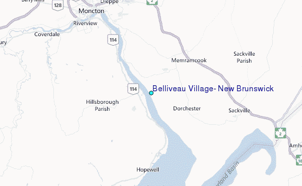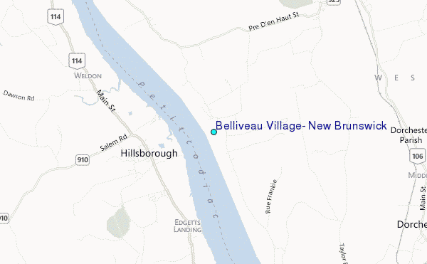Use this relief map to navigate to tide stations, surf breaks and cities that are in the area of Belliveau Village, New Brunswick.