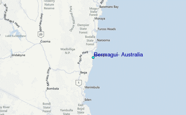 Use this relief map to navigate to tide stations, surf breaks and cities that are in the area of Bermagui, Australia.