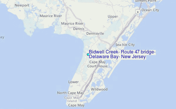 Use this relief map to navigate to tide stations, surf breaks and cities that are in the area of Bidwell Creek, Route 47 bridge, Delaware Bay, New Jersey.