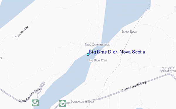 Use this relief map to navigate to tide stations, surf breaks and cities that are in the area of Big Bras D'or, Nova Scotia.