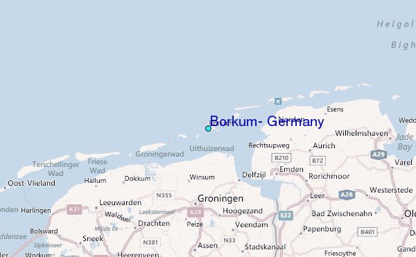 Use this relief map to navigate to tide stations, surf breaks and cities that are in the area of Borkum, Germany.