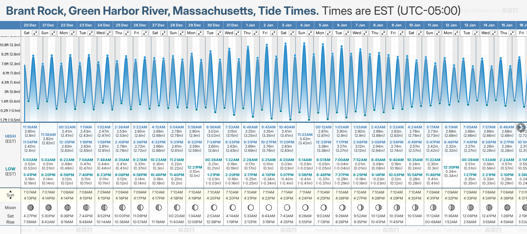 December and January Tide charts for Brant Rock, Green Harbor River: The tide charts below show the height, time and date of high and low tides for the next 30 days.