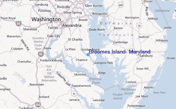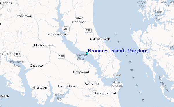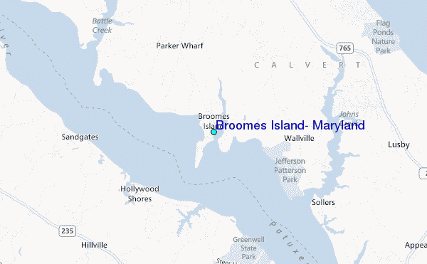 Use this relief map to navigate to tide stations, surf breaks and cities that are in the area of Broomes Island, Maryland.