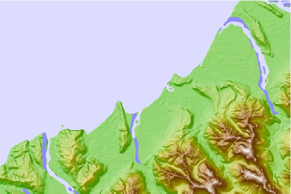 Use this relief map to navigate to tide stations, surf breaks and cities that are in the area of Bruce Bay, New Zealand.