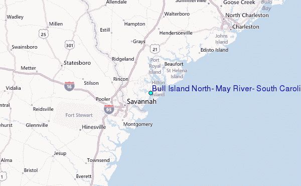 Use this relief map to navigate to tide stations, surf breaks and cities that are in the area of Bull Island North, May River, South Carolina.