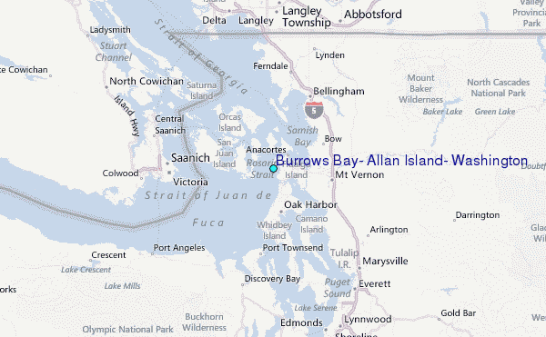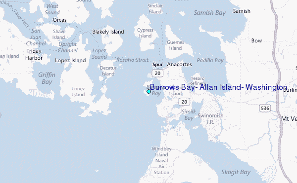 Use this relief map to navigate to tide stations, surf breaks and cities that are in the area of Burrows Bay, Allan Island, Washington.