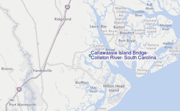 Use this relief map to navigate to tide stations, surf breaks and cities that are in the area of Callawassie Island Bridge, Colleton River, South Carolina.