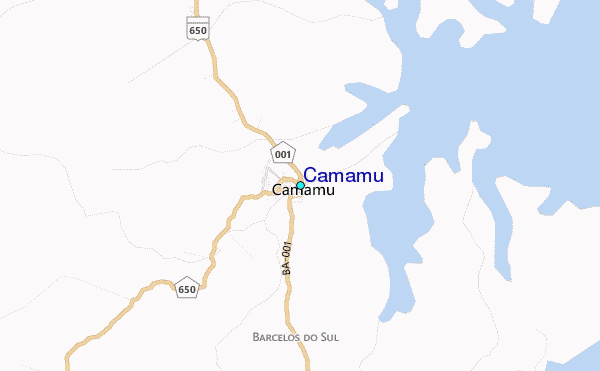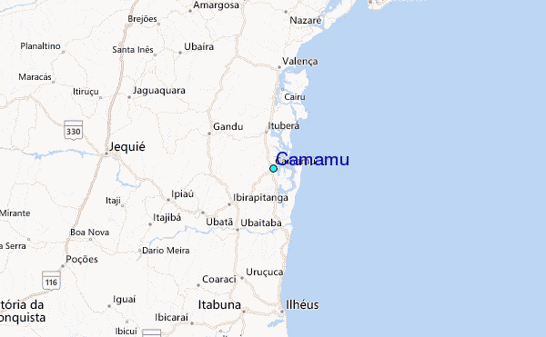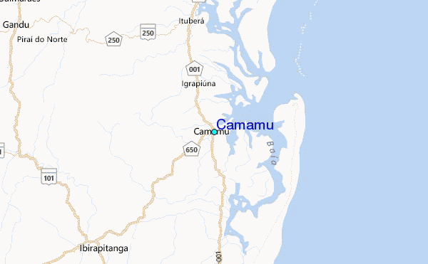 Use this relief map to navigate to tide stations, surf breaks and cities that are in the area of Camamu.