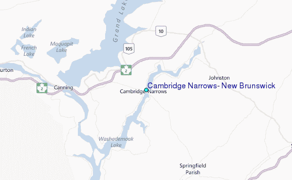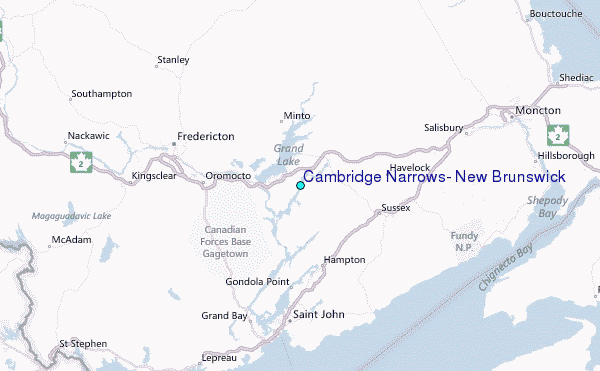 Use this relief map to navigate to tide stations, surf breaks and cities that are in the area of Cambridge Narrows, New Brunswick.