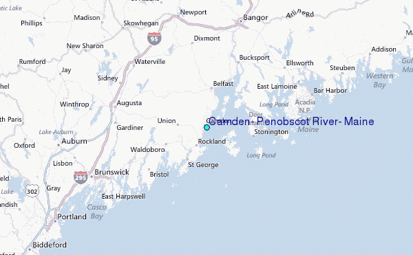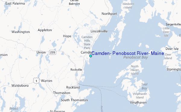 Use this relief map to navigate to tide stations, surf breaks and cities that are in the area of Camden, Penobscot River, Maine.