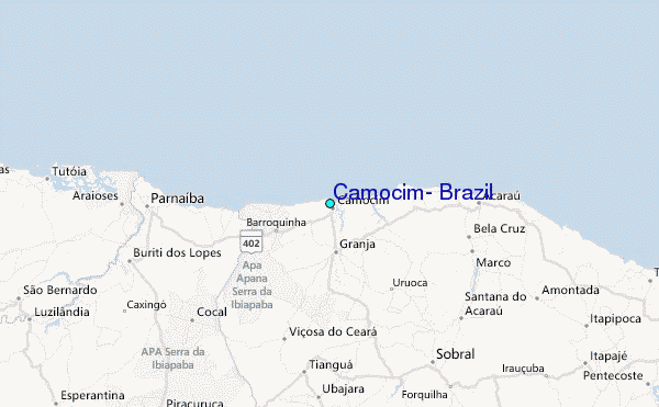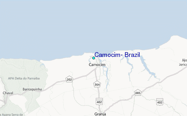 Use this relief map to navigate to tide stations, surf breaks and cities that are in the area of Camocim, Brazil.