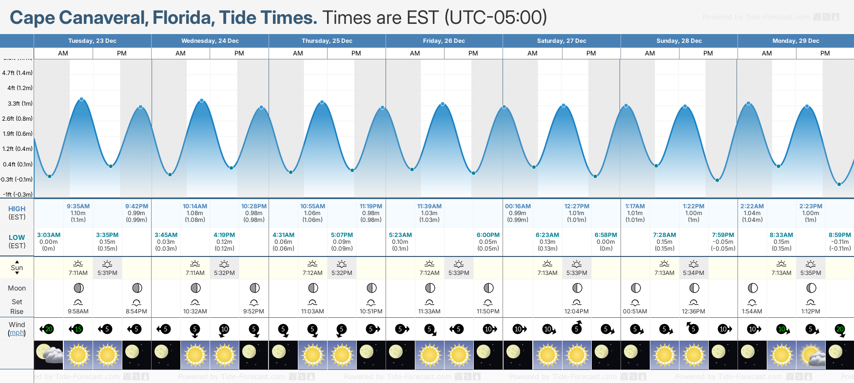 Tide chart for Cape CanaveralShowing low and high tide times for the next 30 days at Cape Canaveral. Tide Times are EST (UTC -5.0hrs).