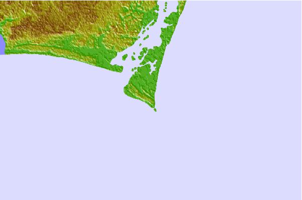 Use this relief map to navigate to tide stations, surf breaks and cities that are in the area of Cape Fear, North Carolina.