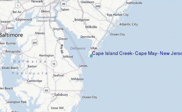 Use this relief map to navigate to tide stations, surf breaks and cities that are in the area of Cape Island Creek, Cape May, New Jersey.