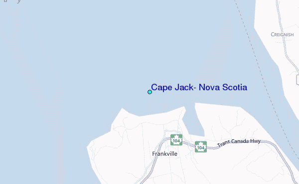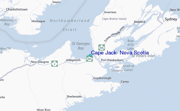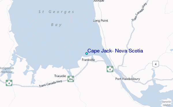 Use this relief map to navigate to tide stations, surf breaks and cities that are in the area of Cape Jack, Nova Scotia.