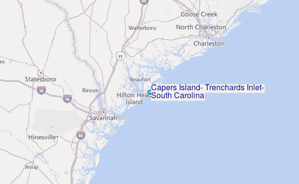 Use this relief map to navigate to tide stations, surf breaks and cities that are in the area of Capers Island, Trenchards Inlet, South Carolina.