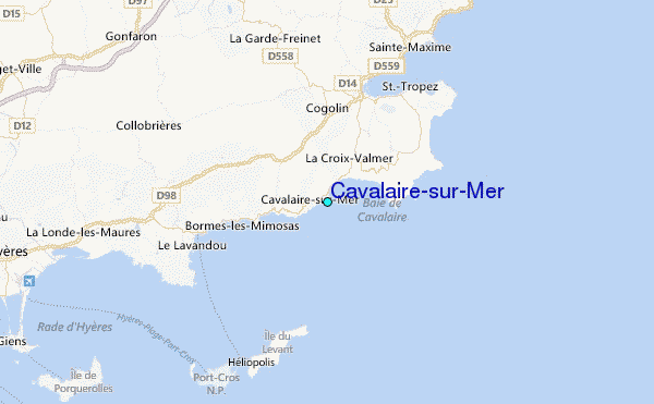 Use this relief map to navigate to tide stations, surf breaks and cities that are in the area of Cavalaire-sur-Mer.