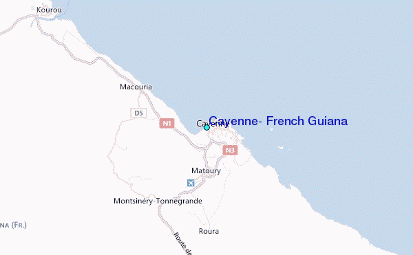 Use this relief map to navigate to tide stations, surf breaks and cities that are in the area of Cayenne, French Guiana.