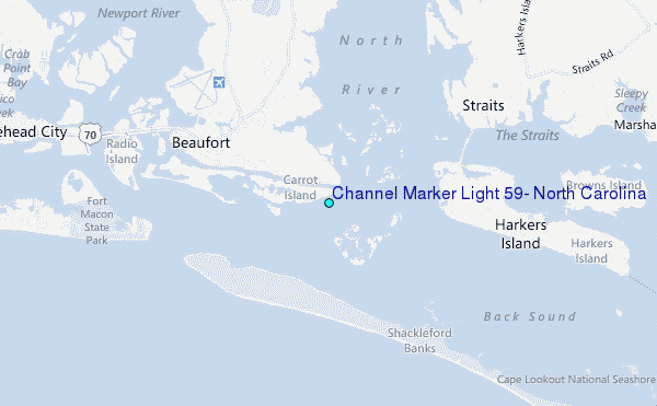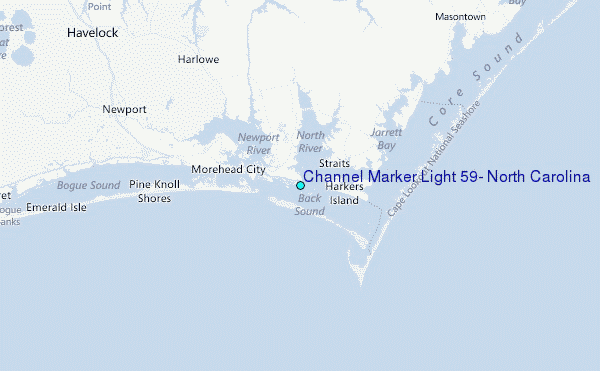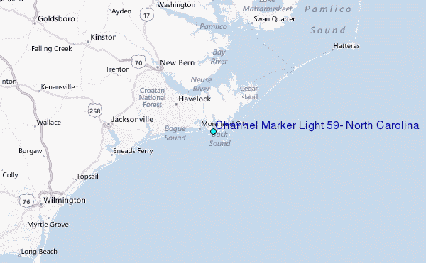 Use this relief map to navigate to tide stations, surf breaks and cities that are in the area of Channel Marker Light #59, North Carolina.