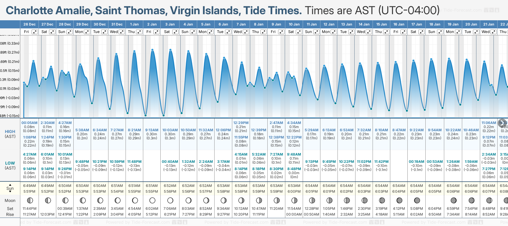 Tide chart for Charlotte AmalieShowing low and high tide times for the next 30 days at Charlotte Amalie. Tide Times are AST (UTC -4.0hrs).
