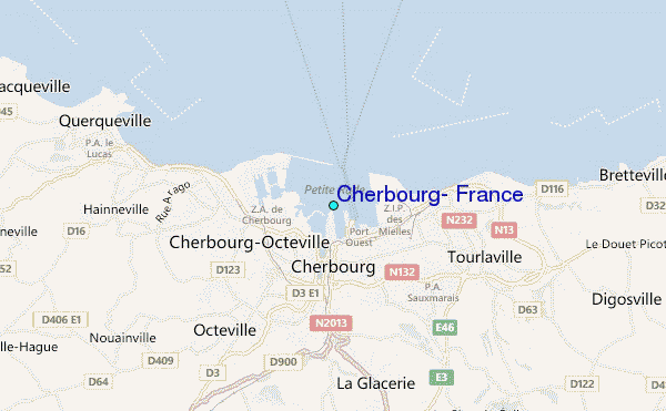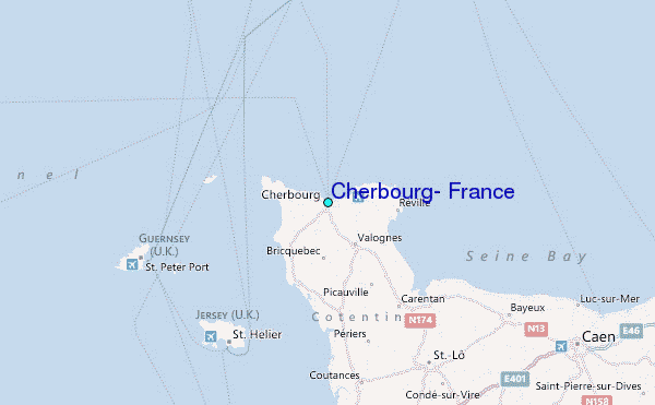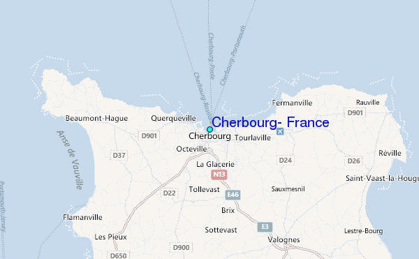 Use this relief map to navigate to tide stations, surf breaks and cities that are in the area of Cherbourg, France.