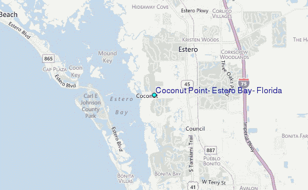 Use this relief map to navigate to tide stations, surf breaks and cities that are in the area of Coconut Point, Estero Bay, Florida.