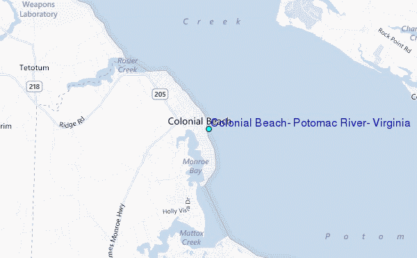 Use this relief map to navigate to tide stations, surf breaks and cities that are in the area of Colonial Beach, Potomac River, Virginia.
