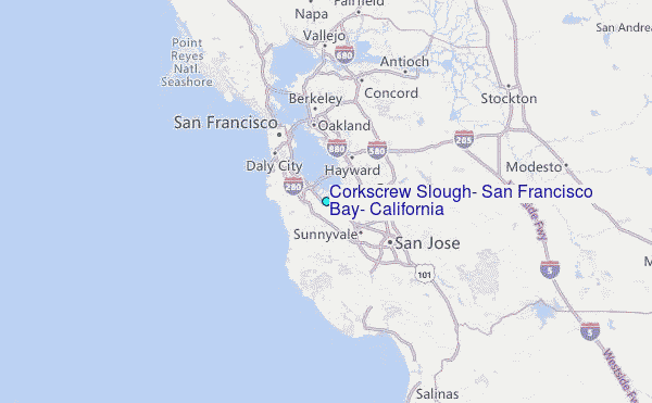 Use this relief map to navigate to tide stations, surf breaks and cities that are in the area of Corkscrew Slough, San Francisco Bay, California.