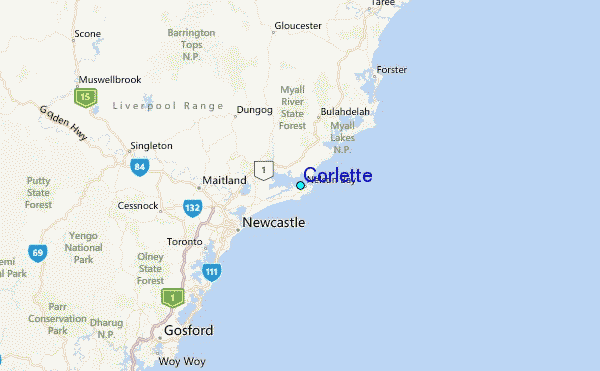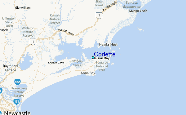 Use this relief map to navigate to tide stations, surf breaks and cities that are in the area of Corlette.