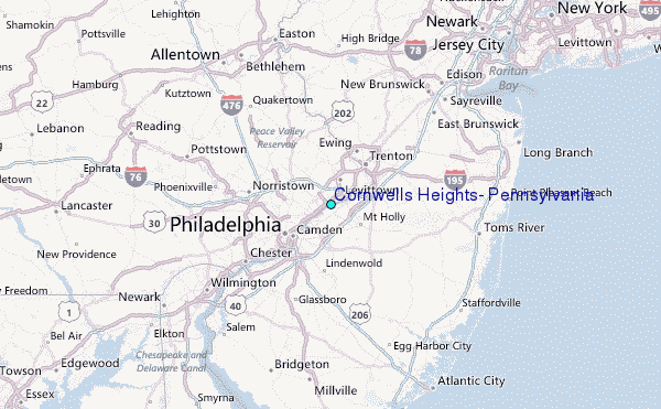 Use this relief map to navigate to tide stations, surf breaks and cities that are in the area of Cornwells Heights, Pennsylvania.