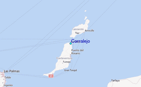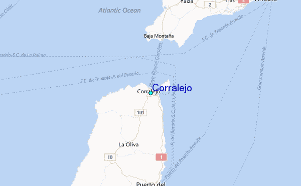 Use this relief map to navigate to tide stations, surf breaks and cities that are in the area of Corralejo.