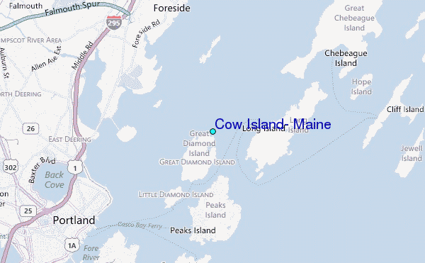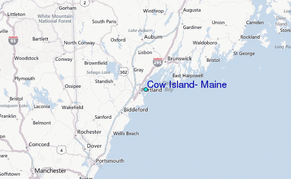 Use this relief map to navigate to tide stations, surf breaks and cities that are in the area of Cow Island, Maine.