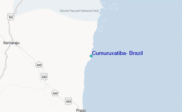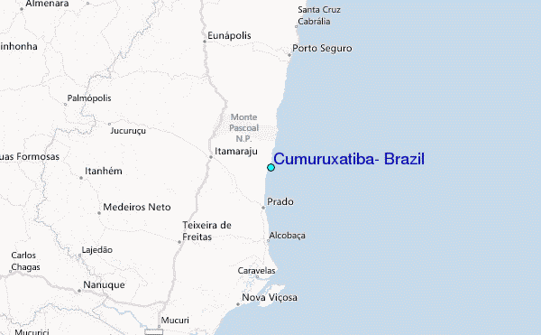 Use this relief map to navigate to tide stations, surf breaks and cities that are in the area of Cumuruxatiba, Brazil.
