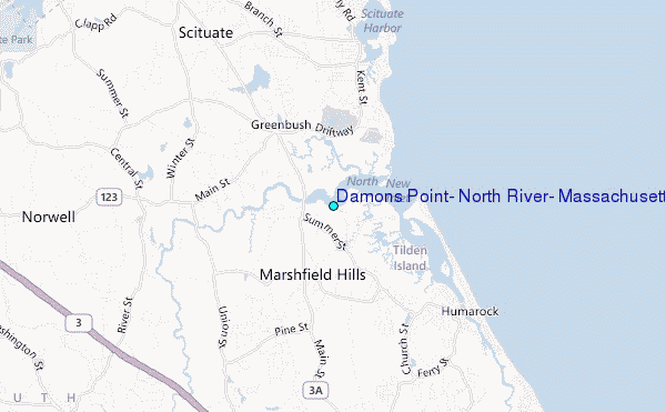 Use this relief map to navigate to tide stations, surf breaks and cities that are in the area of Damons Point, North River, Massachusetts.