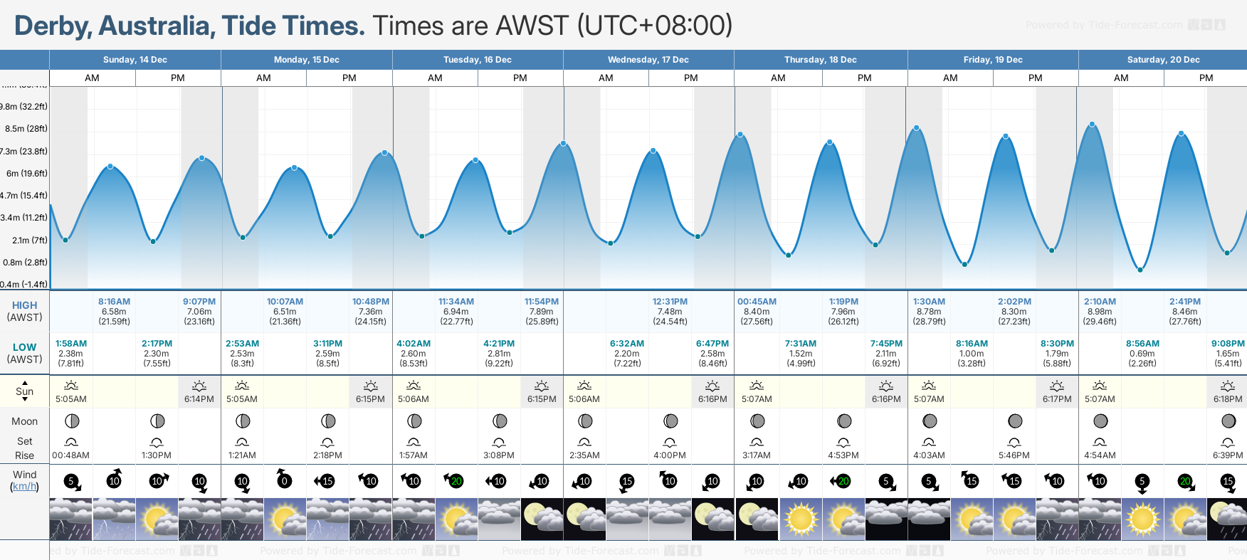 Tide Times are AWST (UTC +8.0hrs). Last Spring High Tide at Derby was on Sat 06 Dec (height: 9.88m 32.4ft). Next high Spring Tide at Derby will be on Sun 21 Dec (height: 9.02m 29.6ft).