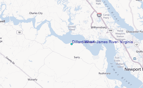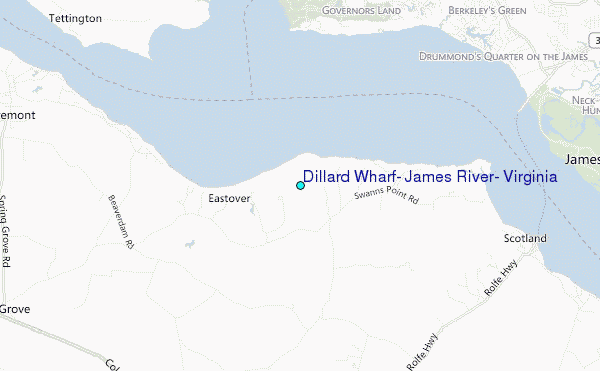 Use this relief map to navigate to tide stations, surf breaks and cities that are in the area of Dillard Wharf, James River, Virginia.