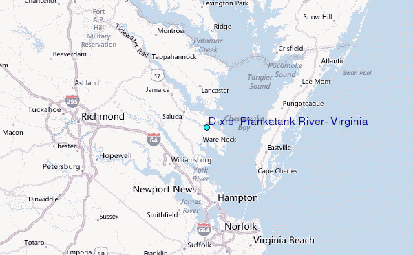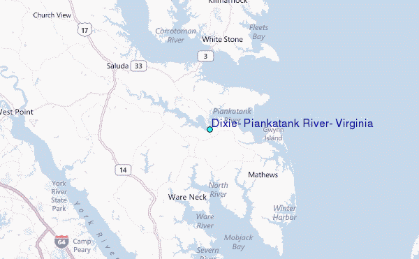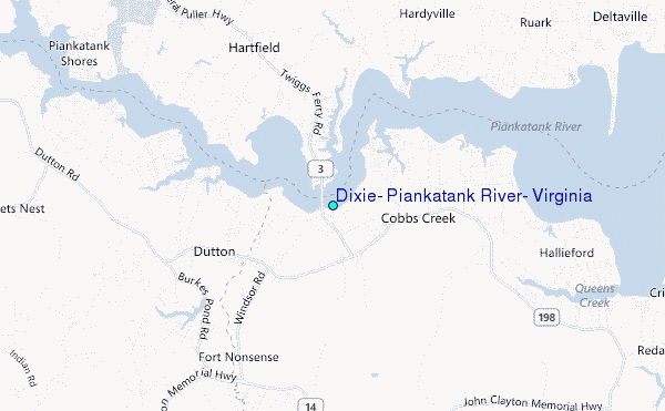 Use this relief map to navigate to tide stations, surf breaks and cities that are in the area of Dixie, Piankatank River, Virginia.