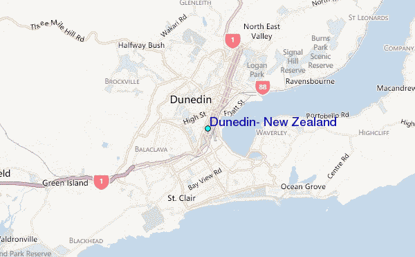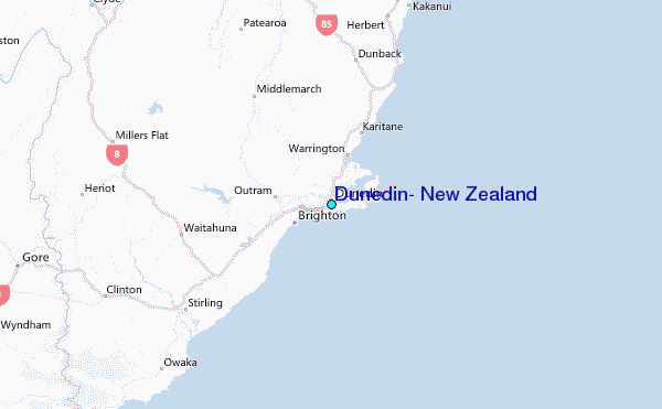 Use this relief map to navigate to tide stations, surf breaks and cities that are in the area of Dunedin, New Zealand.