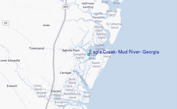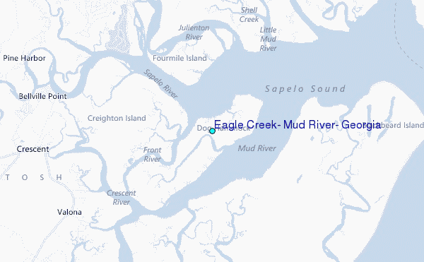 Use this relief map to navigate to tide stations, surf breaks and cities that are in the area of Eagle Creek, Mud River, Georgia.
