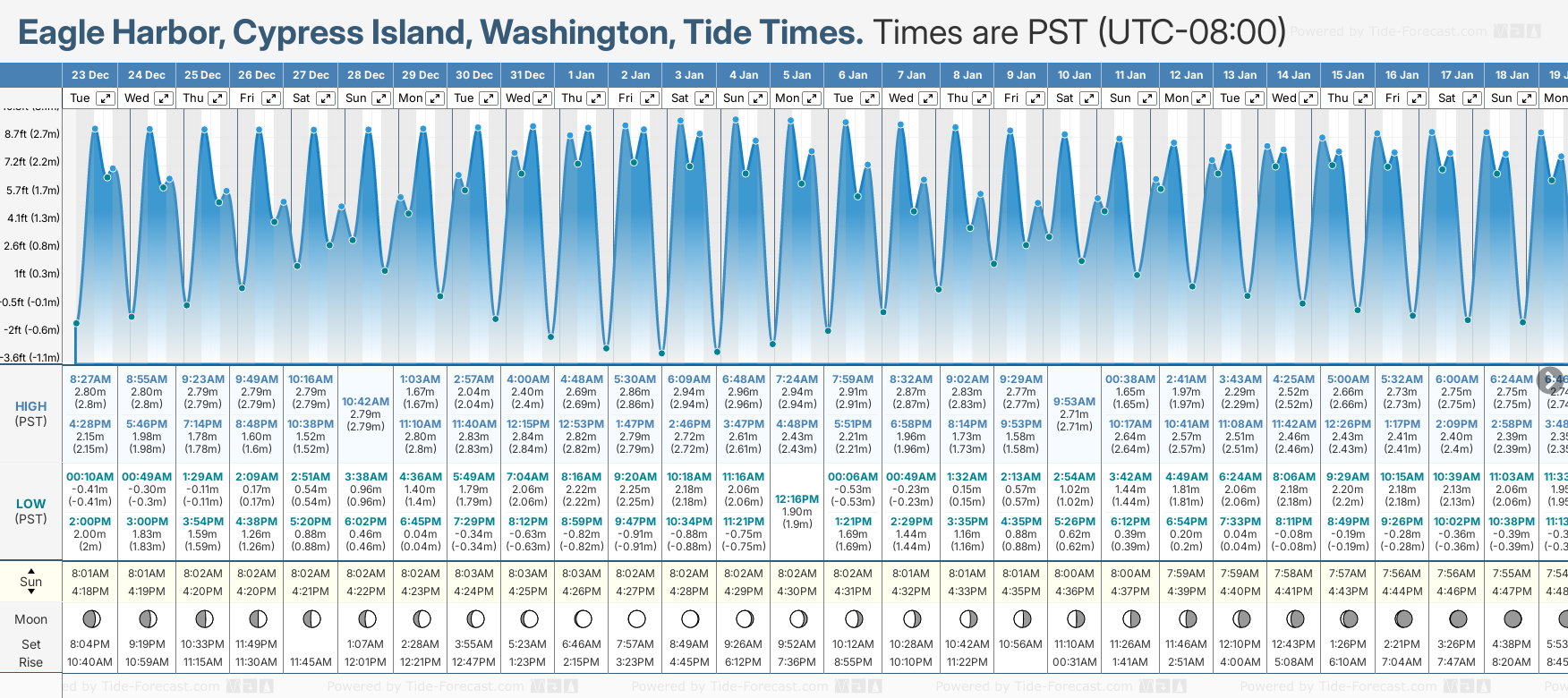 December and January Tide charts for Eagle Harbor, Cypress Island: The tide charts below show the height, time and date of high and low tides for the next 30 days.