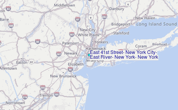 Use this relief map to navigate to tide stations, surf breaks and cities that are in the area of East 41st Street, New York City, East River, New York, New York.