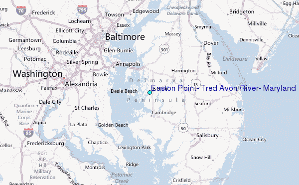 Use this relief map to navigate to tide stations, surf breaks and cities that are in the area of Easton Point, Tred Avon River, Maryland.