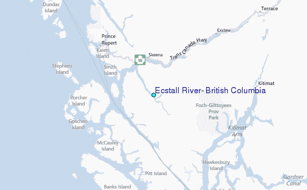Use this relief map to navigate to tide stations, surf breaks and cities that are in the area of Ecstall River, British Columbia.